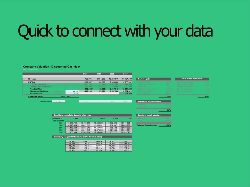 This is an easy to use and neatly structured Excel spreadsheet for the business valuation of companies in Discounted Cashflow approach. All figures are calculated automatically in the template.
