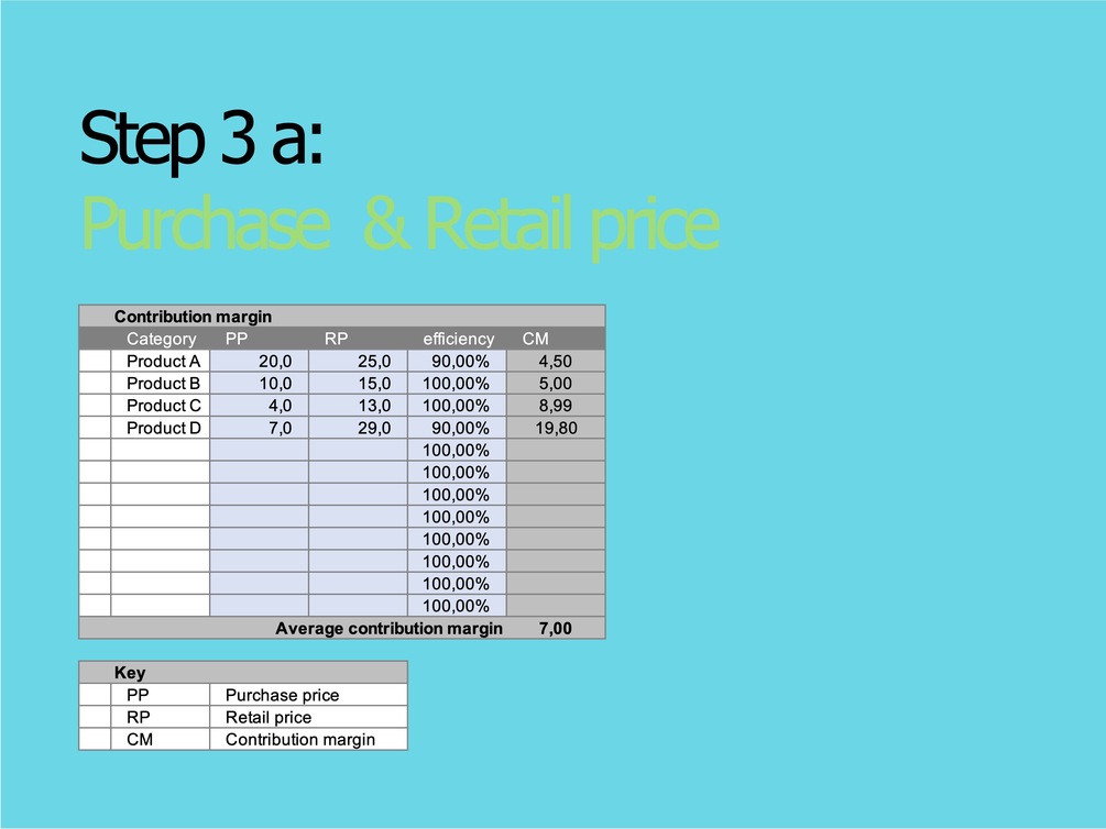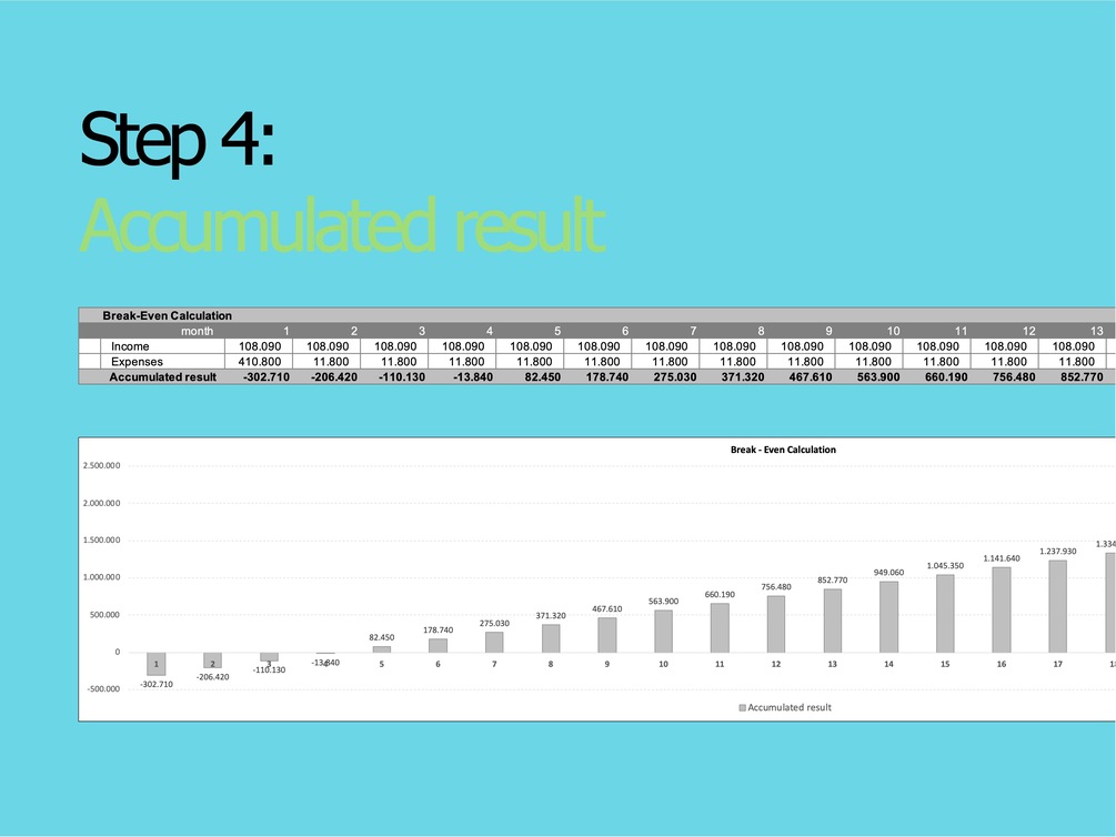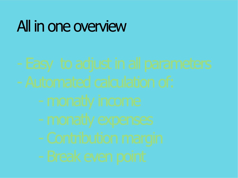 The model calculates the contribution margins based on the inputs of acquisition costs, monthly costs and purchase and sales prices and based on the projection of monthly sales volumes , the income and expenses up to the break-even point.