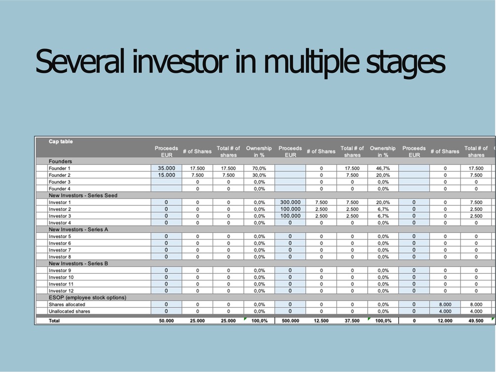 The Excel ist structured is designed as a model of shareholder structures for up to 3 fundings and can easily be adjusted to more funding rounds. The standard is set 4 Investors or founders in each stage.