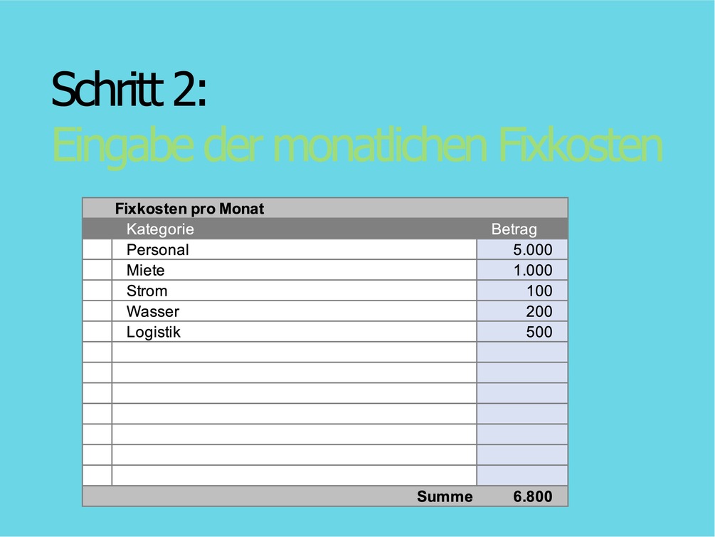 Das Modell berechnet anhand der Eingaben der Anschaffungskosten, monatlichen Kosten sowie Ein- und Verkaufspreise die Deckungsbeiträge und anhand der Hochrechnung der monatlichen Absatzmengen , die Einnahmen und Ausgaben bis zur Gewinnschwelle.