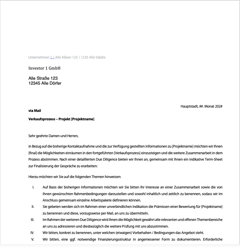 Vorlage für einen Prozessbrief im Rahmen eines Verkaufsprozesses von Unternehmen